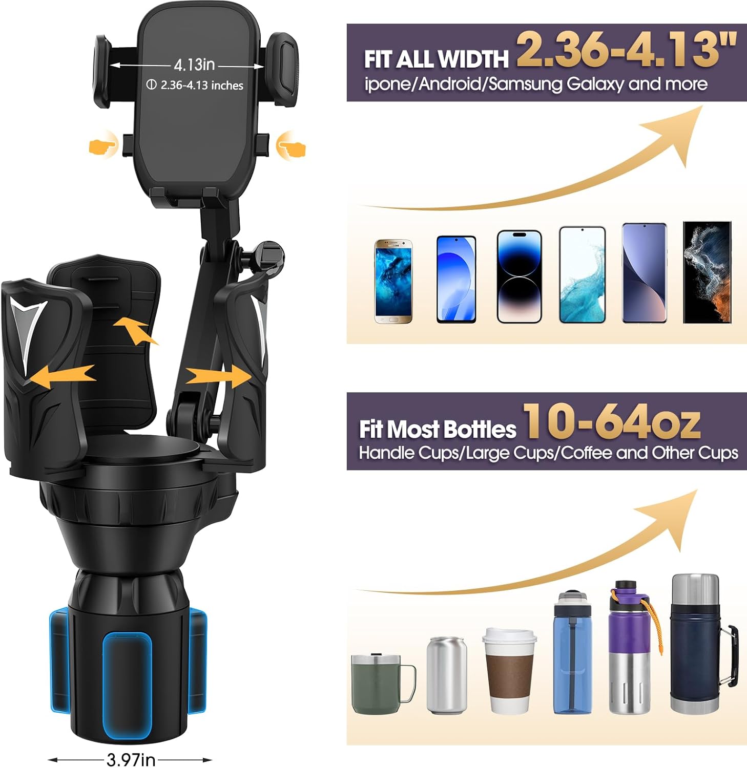 Engineered for heavy-duty hydration. The precision-twist base expands to fit any standard vehicle slot, securely holding 10oz to 48oz tumblers, including Stanley, YETI, and Hydroflask. -