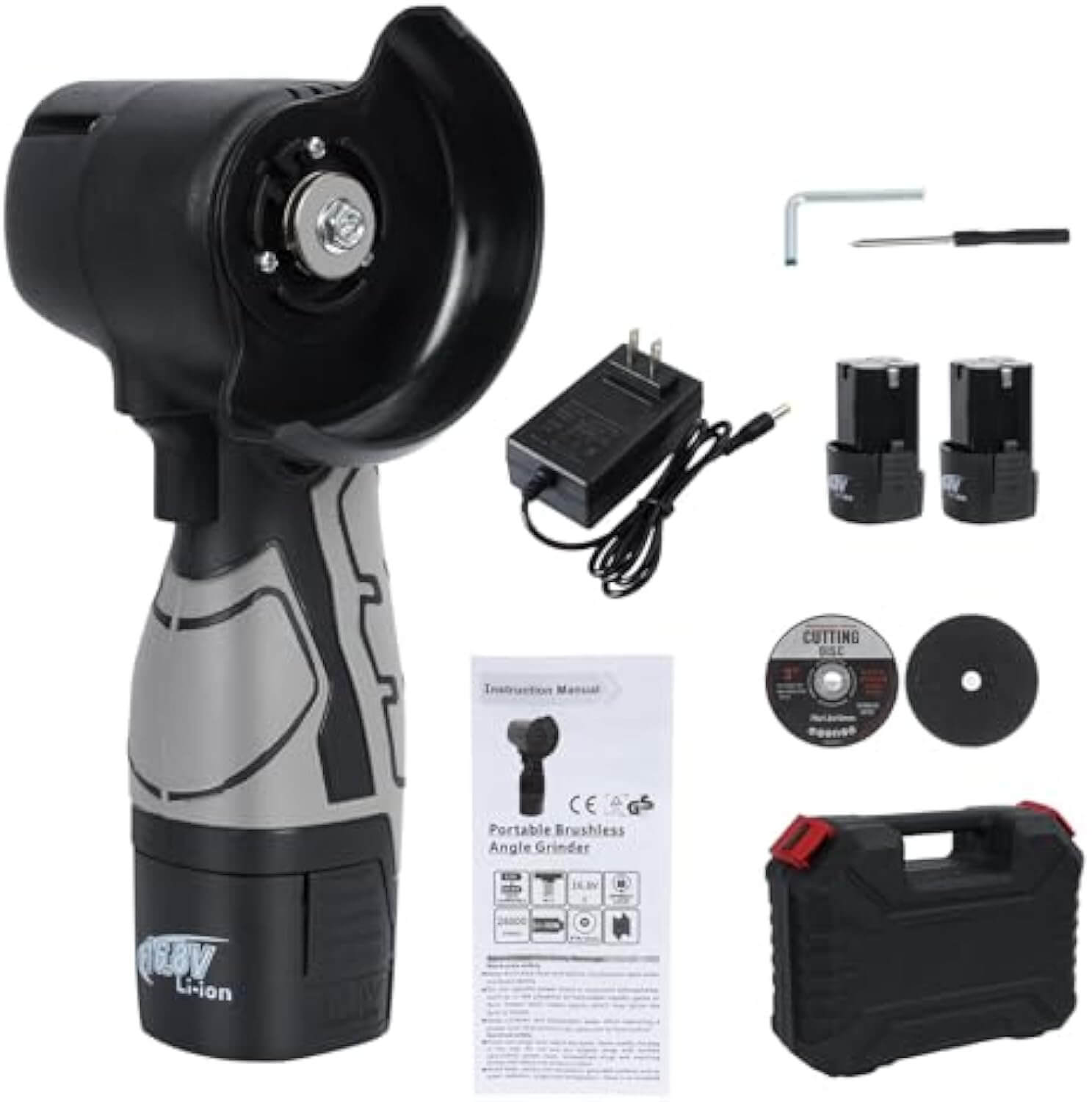 1x Brushless Mini Angle Grinder, 2x Rechargeable Batteries, 1x Charger (US Plug), 2x Cutting Discs, 1x Wrench Kit, 1x Hard Carry Case, 1x User Manual.